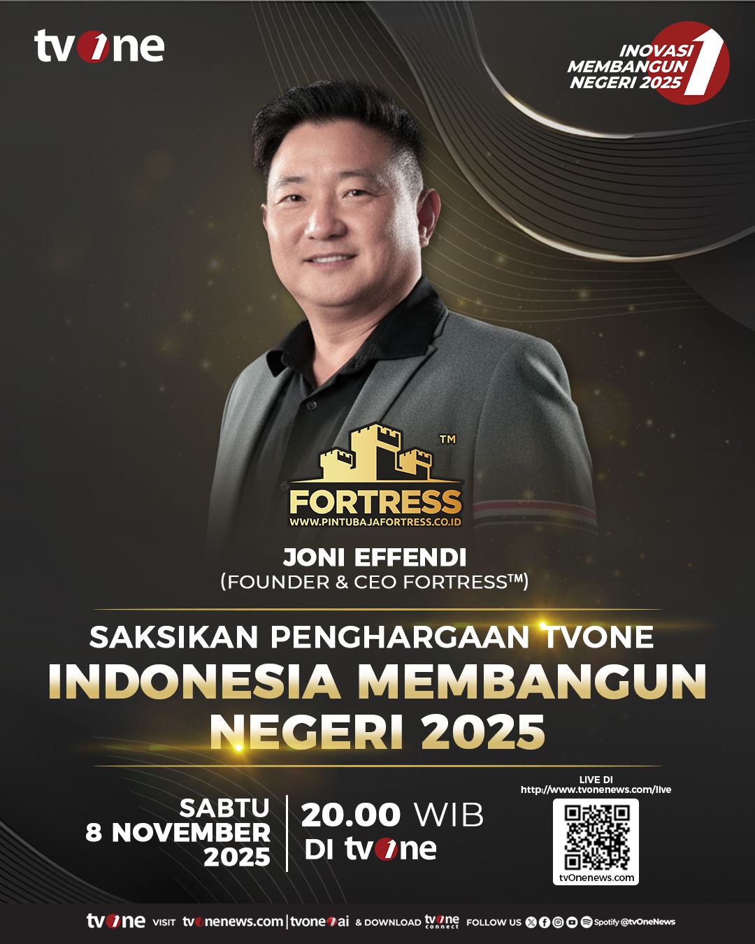 Jakarta, 7 November 2025 — Fortress, merek pintu baja terdepan di Indonesia, kembali meneguhkan posisinya sebagai inovator di bidang keamanan hunian modern. Dalam ajang bergengsi “Membangun Negeri dengan Inovasi 2025” yang diselenggarakan oleh TVOne, Fortress berhasil meraih penghargaan nasional untuk kategori Outstanding Innovation in Smart Security & Design Integration.
